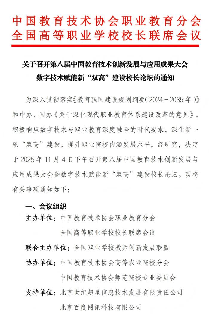 关于召开第八届中国教育技术创新发展与应用成果大会数字技术赋能新“双高”建设校长论坛的通知